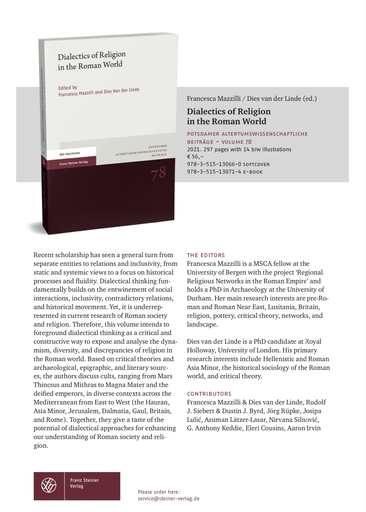 I was happy to join my doktorväter in this important endeavor: understanding the dialectical nature of Roman religion. Our chapter is rooted in the dialectical philosophy of Hegel, and explains the du et des (quid pro quo) aspects of ancient Roman religion. Information on the book, including the Table of Contents and a sample of the chapter, can be found below.
