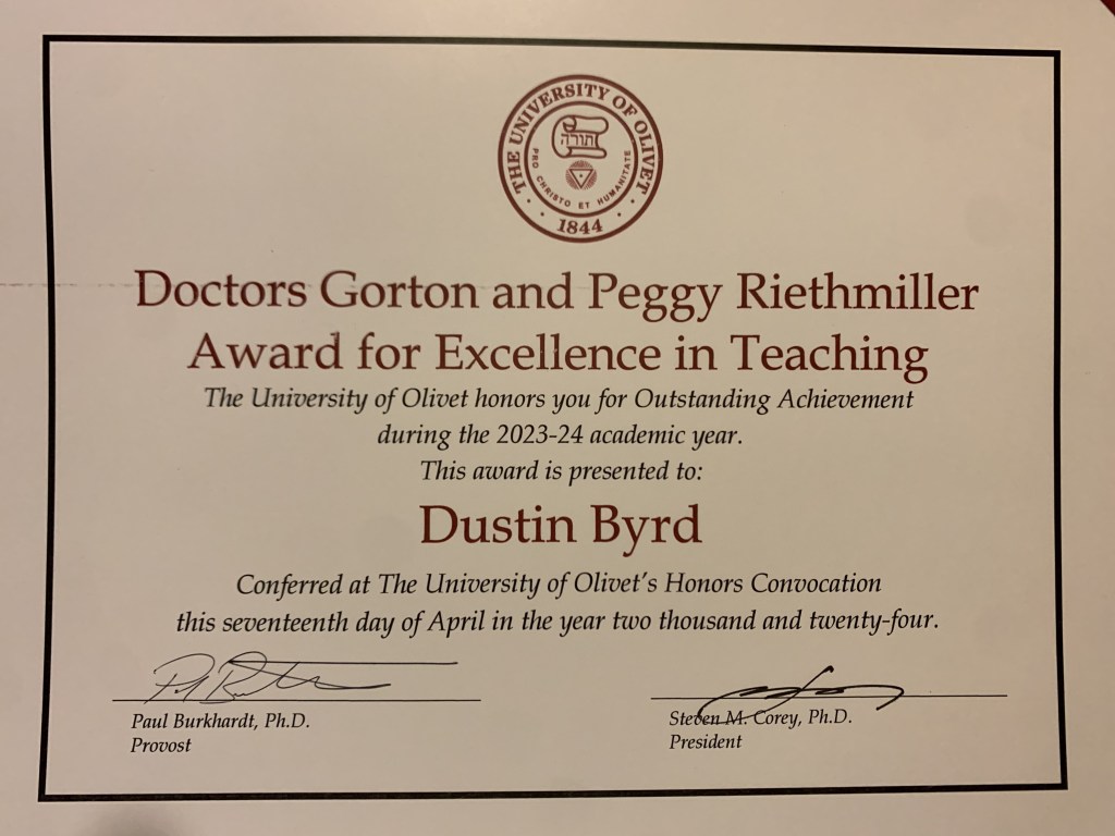 On April 17th, 2024, I was awarded two important awards at The University of Olivet: 1) Doctors Gorton and Peggy Riethmiller Award for Excellence in Teaching, and 2) the Presidential Distinguished Medalist – Most Influential Professor. The first is voted upon by the student body, and the second is given by a top five graduate of the senior class. I was nominated for the latter by Chelsea Wiltse, one of my Philosophy and Religious Studies students. Below is me at Convocation with Sydney Lynch, one of my very gifted and talented students, as well as a dinner I had with The University of Olivet President Steven Corey and Kelly Corey, with my students, Chelsey Wiltse, Taylor Darhower, Garrett Ennis, Sydney Lynch, and Sarah Zaharian, as well as my wife.