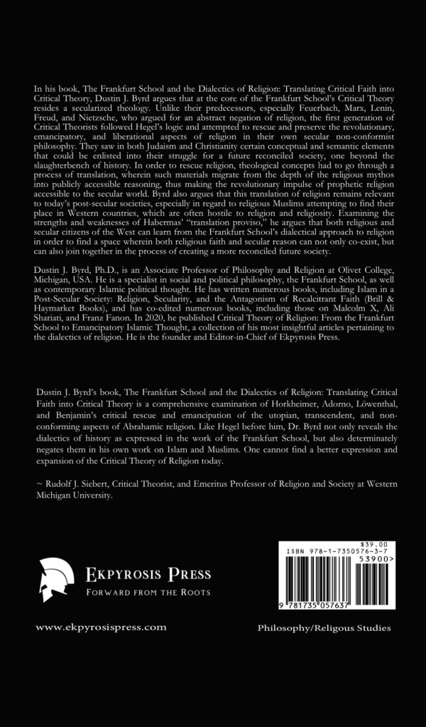 Dustin J. Byrd’s book, The Frankfurt School and the Dialectics of Religion: Translating Critical Faith into Critical Theory, is a comprehensive examination of Horkheimer, Adorno, Löwenthal, and Benjamin’s critical rescue and emancipation of the utopian, transcendent, and non-conforming aspects of Abrahamic religion. Like Hegel before him, Dr. Byrd not only reveals the dialectics of history as expressed in the work of the Frankfurt School, but also determinately negates them in his own work on Islam and Muslims. One cannot find a better expression and expansion of the Critical Theory of Religion today.